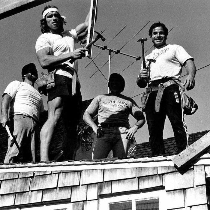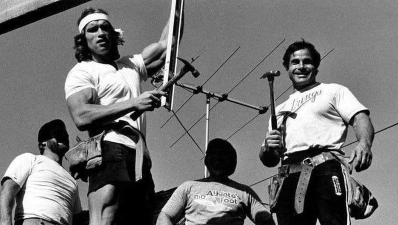At the same time, apart from being a professional bodybuilder (the only one who received a salary paid by a third party for going to the gym in those days), he starts working as a builder with his friend Franco Columbu, another immigrant, Italian in this case.